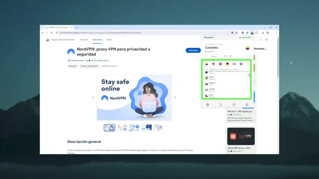 Para instalar la extensión, busca «NordVPN» en la tienda de extensiones de tu navegador. Una vez instalada, inicia sesión y utiliza el botón de «Conexión rápida» para conectarte al mejor servidor disponible.