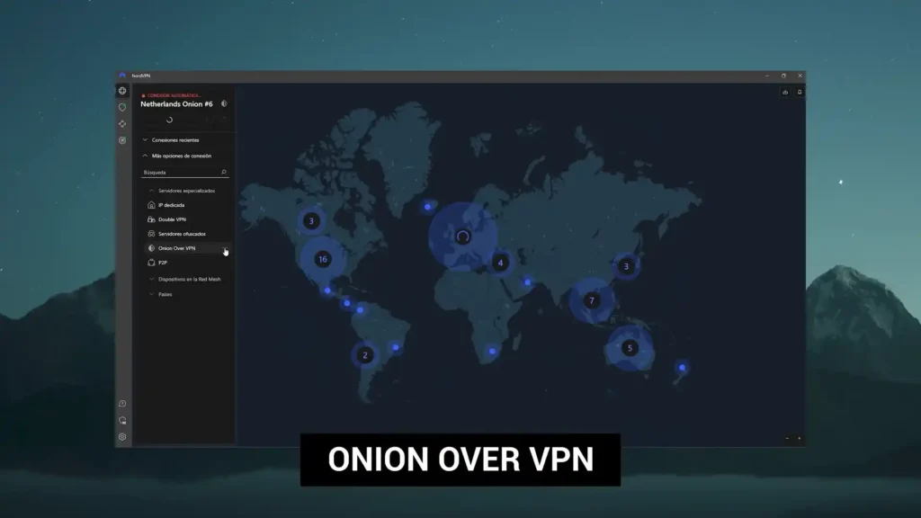 Interfaz de NordVPN mostrando la opción de servidores especializados como Onion Over VPN para mayor privacidad y seguridad.